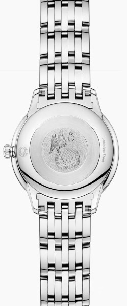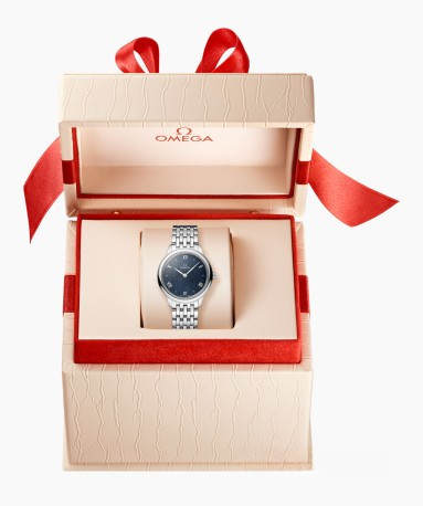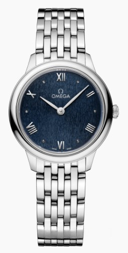 Часы Omega De Ville Prestige Quartz 27.5 mm представлены в корпусе из нержавеющей стали размером 27.5 х 6.3 мм и водонепроницаемостью 30 метров. Внутри корпуса установлен кварцевый механизм, Калибр Omega 4061. На синем циферблате отображаются часы, минуты. Часы поставляются на браслете из нержавеющей стали.