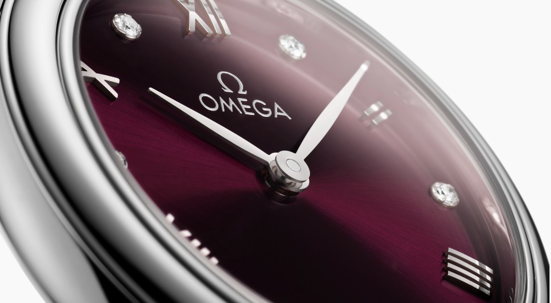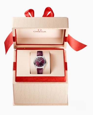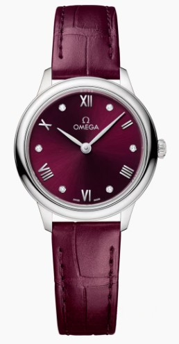 Часы Omega De Ville Prestige Quartz 27.5 mm представлены в корпусе из нержавеющей стали размером 27.5 х 6.3 мм и водонепроницаемостью 30 метров. Внутри корпуса установлен кварцевый механизм, Калибр Omega 4061. На бордовом циферблате с белыми бриллиантами отображаются часы, минуты. Часы поставляются на ремешке из кожи аллигатора с застежкой из нержавеющей стали.