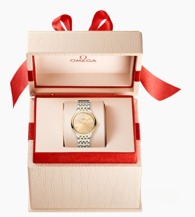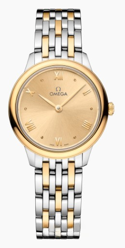 Часы Omega De Ville Prestige Quartz 27.5 mm представлены в корпусе из нержавеющей стали и желтого золота 18к размером 27.5 х 6.3 мм и водонепроницаемостью 30 метров. Внутри корпуса установлен кварцевый механизм, Калибр Omega 4061. На золотистом циферблате отображаются часы, минуты. Часы поставляются на браслете из нержавеющей стали и желтого золота 18к.