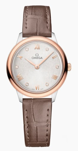 Часы Omega De Ville Prestige Quartz 27.5 mm представлены в корпусе из нержавеющей стали и розового золота 18к размером 27.5 х 6.3 мм и водонепроницаемостью 30 метров. Внутри корпуса установлен кварцевый механизм, Калибр Omega 4061. На серебристом циферблате с 6-ю белыми бриллиантами отображаются часы, минуты. Часы поставляются на ремешке из кожи аллигатора с застежкой из нержавеющей стали.