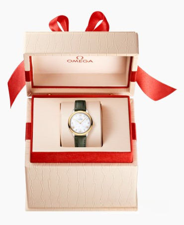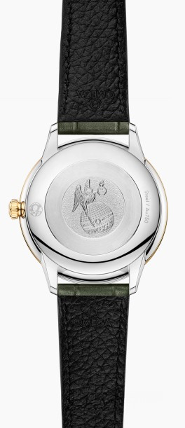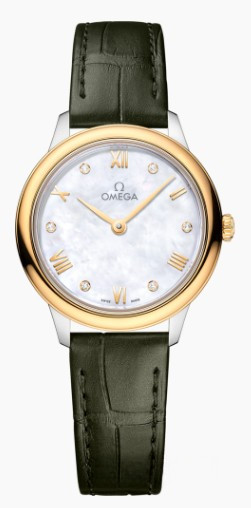 Часы Omega De Ville Prestige Quartz 27.5 mm представлены в корпусе из нержавеющей стали и желтого золота 18к размером 27.5 х 6.3 мм и водонепроницаемостью 30 метров. Внутри корпуса установлен кварцевый механизм, Калибр Omega 4061. На белом жемчужном циферблате с 6-ю белыми бриллиантами отображаются часы, минуты. Часы поставляются на ремешке из кожи аллигатора с застежкой из нержавеющей стали.