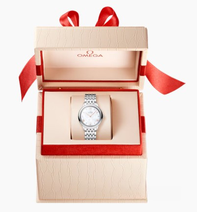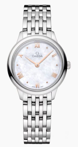Часы Omega De Ville Prestige Quartz 27.5 mm представлены в корпусе из нержавеющей стали размером 27.5 х 6.3 мм и водонепроницаемостью 30 метров. Внутри корпуса установлен кварцевый механизм, Калибр Omega 4061. На белом жемчужном циферблате отображаются часы, минуты. Часы поставляются на браслете из нержавеющей стали.