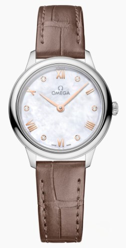 Часы Omega De Ville Prestige Quartz 27.5 mm представлены в корпусе из нержавеющей стали размером 27.5 х 6.3 мм и водонепроницаемостью 30 метров. Внутри корпуса установлен кварцевый механизм, Калибр Omega 4061. На белом жемчужном циферблате с 6-ю белыми бриллиантами отображаются часы, минуты. Часы поставляются на ремешке из кожи аллигатора с застежкой из нержавеющей стали.