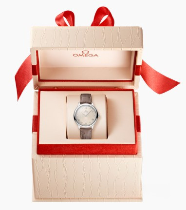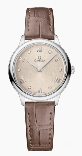Часы Omega De Ville Prestige Quartz 27.5 mm представлены в корпусе из нержавеющей стали размером 27.5 х 6.3 мм и водонепроницаемостью 30 метров. Внутри корпуса установлен кварцевый механизм, Калибр Omega 4061. На золотистом циферблате с 6-ю белыми бриллиантами отображаются часы, минуты. Часы поставляются на ремешке из кожи аллигатора с застежкой из нержавеющей стали.