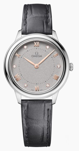 Часы Omega De Ville Prestige Quartz 30 mm представлены в корпусе из нержавеющей стали размером 30 х 7.3 мм и водонепроницаемостью 30 метров. Внутри корпуса установлен кварцевый механизм, Калибр Omega 4061. На сером циферблате с 6-ю белыми бриллиантами отображаются часы, минуты. Часы поставляются на ремешке из кожи аллигатора с застежкой из нержавеющей стали.