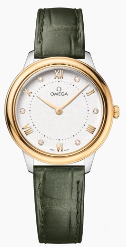Часы Omega De Ville Prestige Quartz 30 mm представлены в корпусе из нержавеющей стали и желтого золота 18к размером 30 х 7.3 мм и водонепроницаемостью 30 метров. Внутри корпуса установлен кварцевый механизм, Калибр Omega 4061. На серебристом циферблате с 6-ю белыми бриллиантами отображаются часы, минуты. Часы поставляются на ремешке из кожи аллигатора с застежкой из нержавеющей стали.