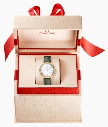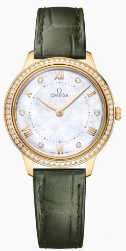 Часы Omega De Ville Prestige Quartz 30 mm представлены в корпусе из желтого золота 18к размером 30 х 7.3 мм и водонепроницаемостью 30 метров. Внутри корпуса установлен кварцевый механизм, Калибр Omega 4061. На белом жемчужном циферблате с 6-ю белыми бриллиантами отображаются часы, минуты. Часы поставляются на ремешке из кожи аллигатора с золотой застежкой. Безель из белых бриллиантов.