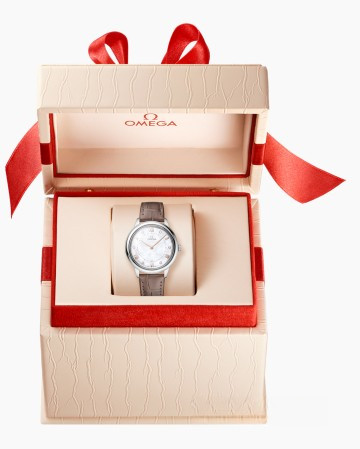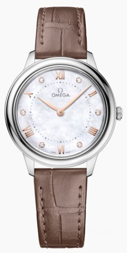 Часы Omega De Ville Prestige Quartz 30 mm представлены в корпусе из нержавеющей стали размером 30 х 7.3 мм и водонепроницаемостью 30 метров. Внутри корпуса установлен кварцевый механизм, Калибр Omega 4061. На белом жемчужном циферблате с 6-ю белыми бриллиантами отображаются часы, минуты. Часы поставляются на ремешке из кожи аллигатора с застежкой из нержавеющей стали.