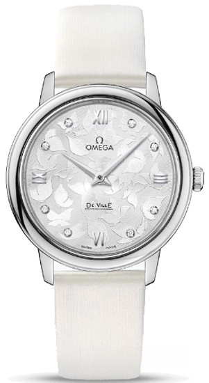Модель часов OMEGA De Ville Prestige «Butterfly» исполнена истинной красоты, позаимствованной у завораживающего своей грацией мира природы. Данная модель имеет серебристый циферблат с бриллиантами и уникальным узором в виде бабочек, нанесенным методом ramolayage («точечного орнамента»). Корпус диаметром 32,7 мм из нержавеющей стали дополняет белый сатинированный кожаный ремешок. Основу этих часов De Ville Prestige «Butterfly» составляет кварцевый часовой механизм OMEGA, калибр 4061.