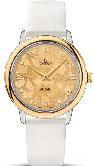 Модель часов OMEGA De Ville Prestige «Butterfly» исполнена истинной красоты, позаимствованной у завораживающего своей грацией мира природы. Данная модель имеет циферблат цвета шампанского с бриллиантами и уникальным узором в виде бабочек, нанесенным методом ramolayage («точечного орнамента»). Безель из 18-каратного желтого золота закреплен на корпусе диаметром 32,7 мм из нержавеющей стали, который дополняет белый сатинированный кожаный ремешок. Основу этих часов De Ville Prestige «Butterfly» составляет кварцевый часовой механизм OMEGA, калибр 4061.