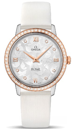 Модель часов OMEGA De Ville Prestige «Butterfly» исполнена истинной красоты, позаимствованной у завораживающего своей грацией мира природы. Данная модель имеет серебристый циферблат с бриллиантами и уникальным узором в виде бабочек, нанесенным методом ramolayage («точечного орнамента»). Украшенный бриллиантами безель из 18-каратного розового золота закреплен на корпусе диаметром 32,7 мм из нержавеющей стали, который дополняет белый сатинированный кожаный ремешок. Основу этих часов De Ville Prestige «Butterfly» составляет кварцевый часовой механизм OMEGA, калибр 4061.