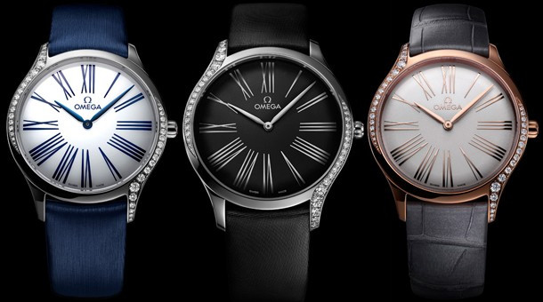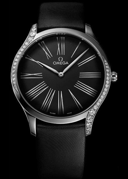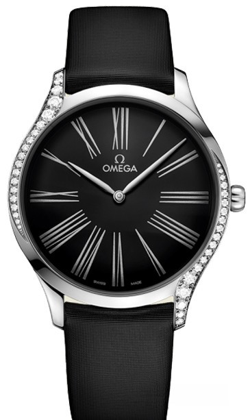 Часы Trésor с корпусом классической формы из нержавеющей стали обладают размером 39 х 9.75 мм. Водонепроницаемость корпуса составляет 30 метров. Внутри находится кварцевый механизм Omega. На черном циферблате отображаются крупные римские цифры, по центру находятся часовая и минутная стрелки. Часы поставляются на сатиновом ремешке с вставкой из нержавеющей стали. Корпус инкрустирован белыми бриллиантами.