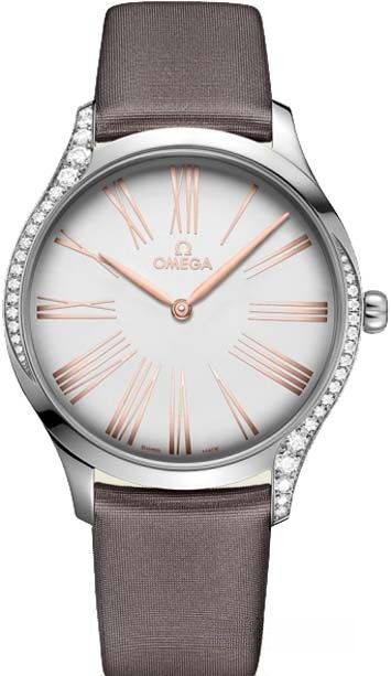 Часы Trésor с корпусом классической формы из нержавеющей стали обладают размером 39 х 9.75 мм. Водонепроницаемость корпуса составляет 30 метров. Внутри находится кварцевый механизм Omega. На серебристом циферблате отображаются крупные римские цифры, по центру находятся часовая и минутная стрелки. Часы поставляются на сатиновом ремешке с вставкой из нержавеющей стали. Корпус инкрустирован белыми бриллиантами.