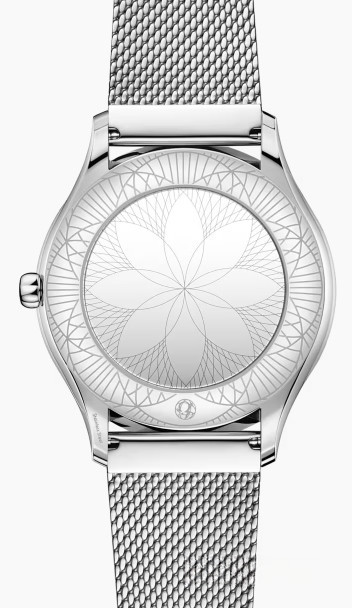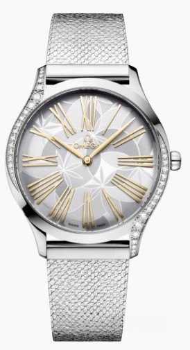 Часы Trésor с корпусом классической формы из нержавеющей стали обладают размером 36 мм. Водонепроницаемость корпуса составляет 30 метров. Внутри находится кварцевый механизм Omega. На серебристом циферблате отображаются крупные римские цифры, по центру находятся часовая и минутная стрелки. Часы поставляются на браслете из нержавеющей стали. Безель из белых бриллиантов.