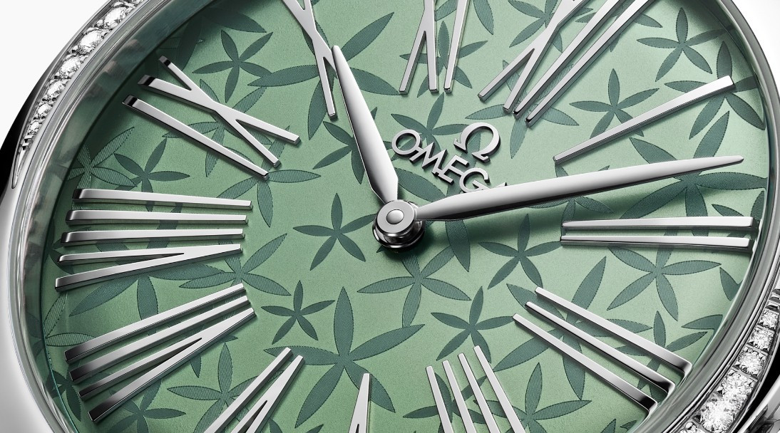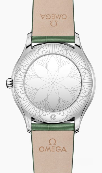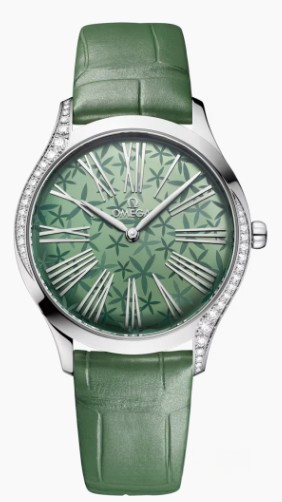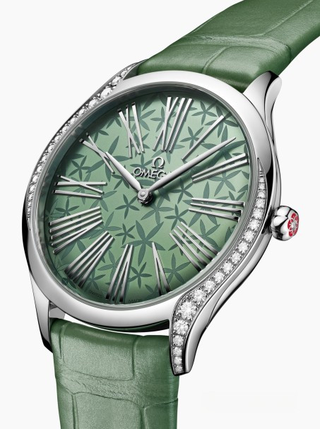 Часы Trésor с корпусом классической формы из нержавеющей стали обладают размером 36 мм. Водонепроницаемость корпуса составляет 30 метров. Внутри находится кварцевый механизм Omega. На зеленом циферблате отображаются крупные римские цифры, по центру находятся часовая и минутная стрелки. Часы поставляются на ремешке из кожи аллигатора. Безель из белых бриллиантов.