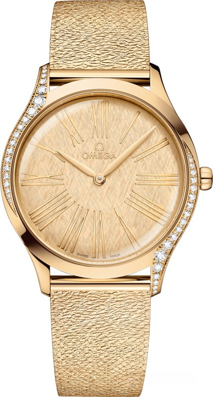 Часы Trésor с корпусом классической формы из розового золота 18к обладают размером 36 мм. Водонепроницаемость корпуса составляет 30 метров. Внутри находится кварцевый механизм Omega. На золотистом скелетированном циферблате отображаются крупные римские цифры, по центру находятся часовая и минутная стрелки. Часы поставляются на браслете из розового золота 18к. Корпус инкрустирован белыми бриллиантами.