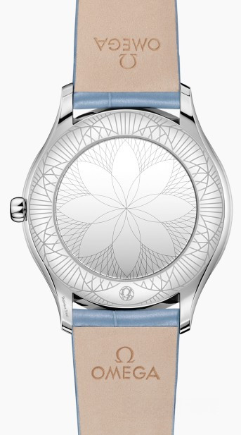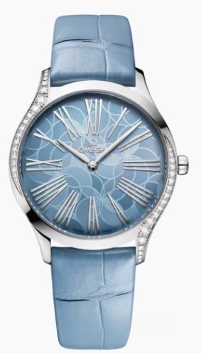 Часы Trésor с корпусом классической формы из нержавеющей стали обладают размером 36 мм. Водонепроницаемость корпуса составляет 30 метров. Внутри находится кварцевый механизм Omega. На голубом циферблате отображаются крупные римские цифры, по центру находятся часовая и минутная стрелки. Часы поставляются на ремешке из кожи аллигатора. Безель из белых бриллиантов.