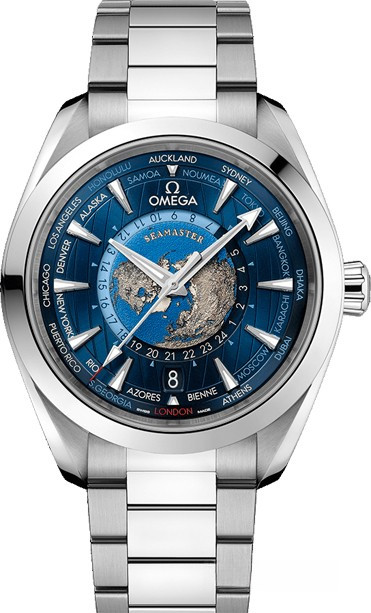 Часы Omega Seamaster Aqua Terra 150 m GMT Worldtimer 43 mm представлены в корпусе диаметром 43 мм из нержавеющей стали водонерпоницаемостью до 150 метров. Внутри корпуса установлен автоматический механизм, Калибр 8938, обладающий запасом хода 60 часов. На синем гильошированном циферблате отображаются часы, минуты, дата, индикатор день/ночь, 24 часовых пояса. Часы копмлектуются браслетом из нержавеющей стали.