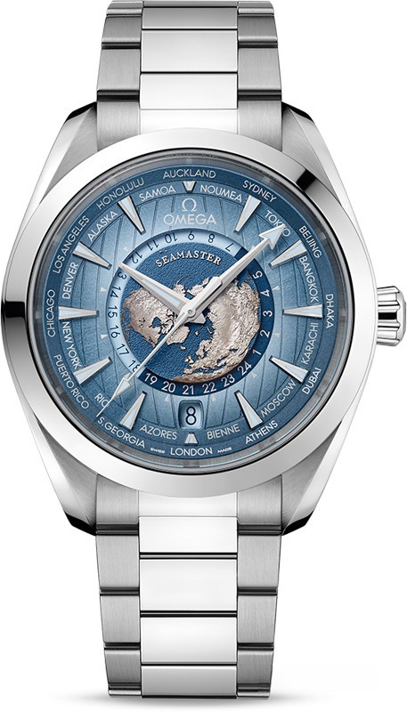 Часы Omega Seamaster Aqua Terra 150 m GMT Worldtimer 43 mm представлены в корпусе диаметром 43 мм из нержавеющей стали водонерпоницаемостью до 150 метров. Внутри корпуса установлен автоматический механизм, Калибр 8938, обладающий запасом хода 60 часов. На голубом гильошированном циферблате отображаются часы, минуты, дата, индикатор день/ночь, 24 часовых пояса. Часы копмлектуются браслетом из нержавеющей стали.