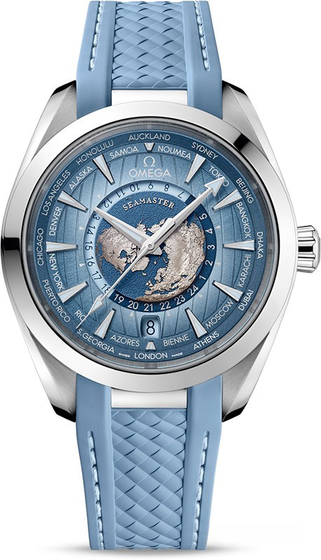 Часы Omega Seamaster Aqua Terra 150 m GMT Worldtimer 43 mm представлены в корпусе диаметром 43 мм из нержавеющей стали водонерпоницаемостью до 150 метров. Внутри корпуса установлен автоматический механизм, Калибр 8938, обладающий запасом хода 60 часов. На голубом гильошированном циферблате отображаются часы, минуты, дата, индикатор день/ночь, 24 часовых пояса. Часы копмлектуются каучуковым ремешком с застежкой из нержавеющей стали.