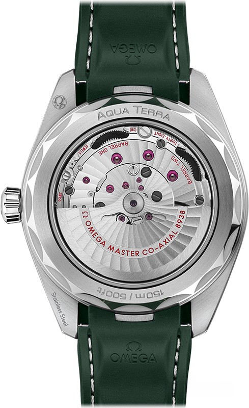 Часы Omega Seamaster Aqua Terra 150 m GMT Worldtimer 43 mm представлены в корпусе диаметром 43 мм из нержавеющей стали водонерпоницаемостью до 150 метров. Внутри корпуса установлен автоматический механизм, Калибр 8938, обладающий запасом хода 60 часов. На зеленом гильошированном циферблате отображаются часы, минуты, дата, индикатор день/ночь, 24 часовых пояса. Часы копмлектуются каучуковым ремешком с застежкой из нержавеющей стали.