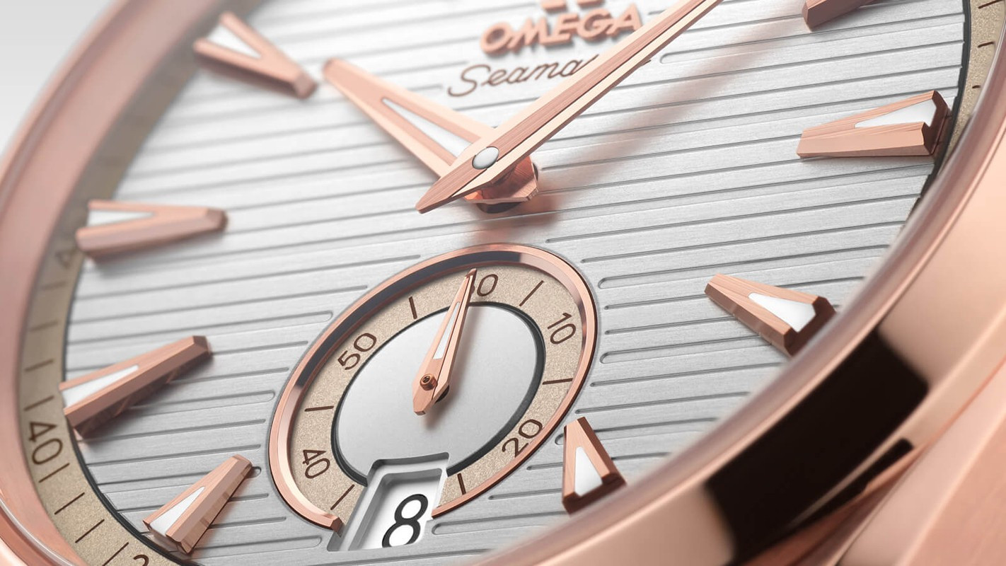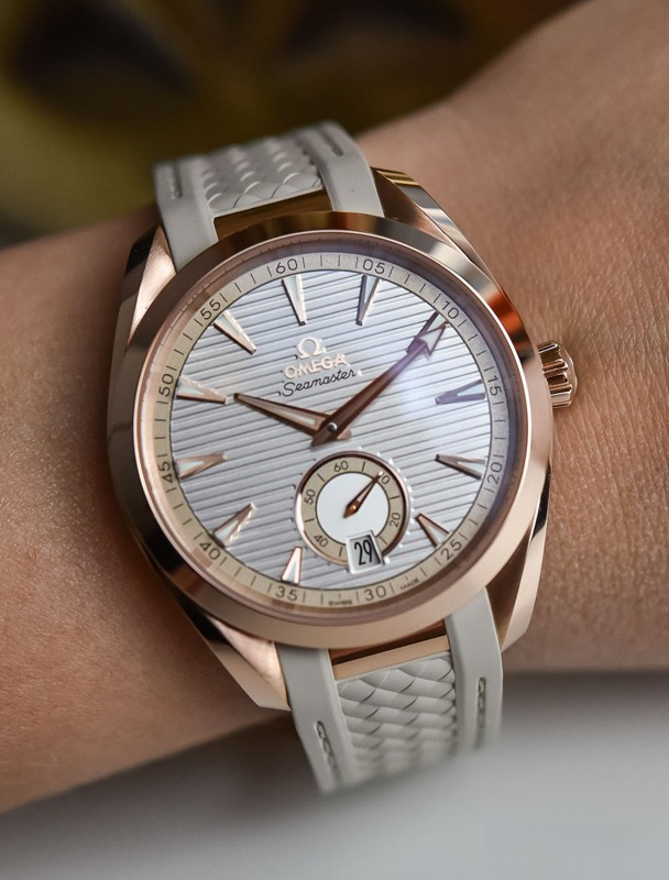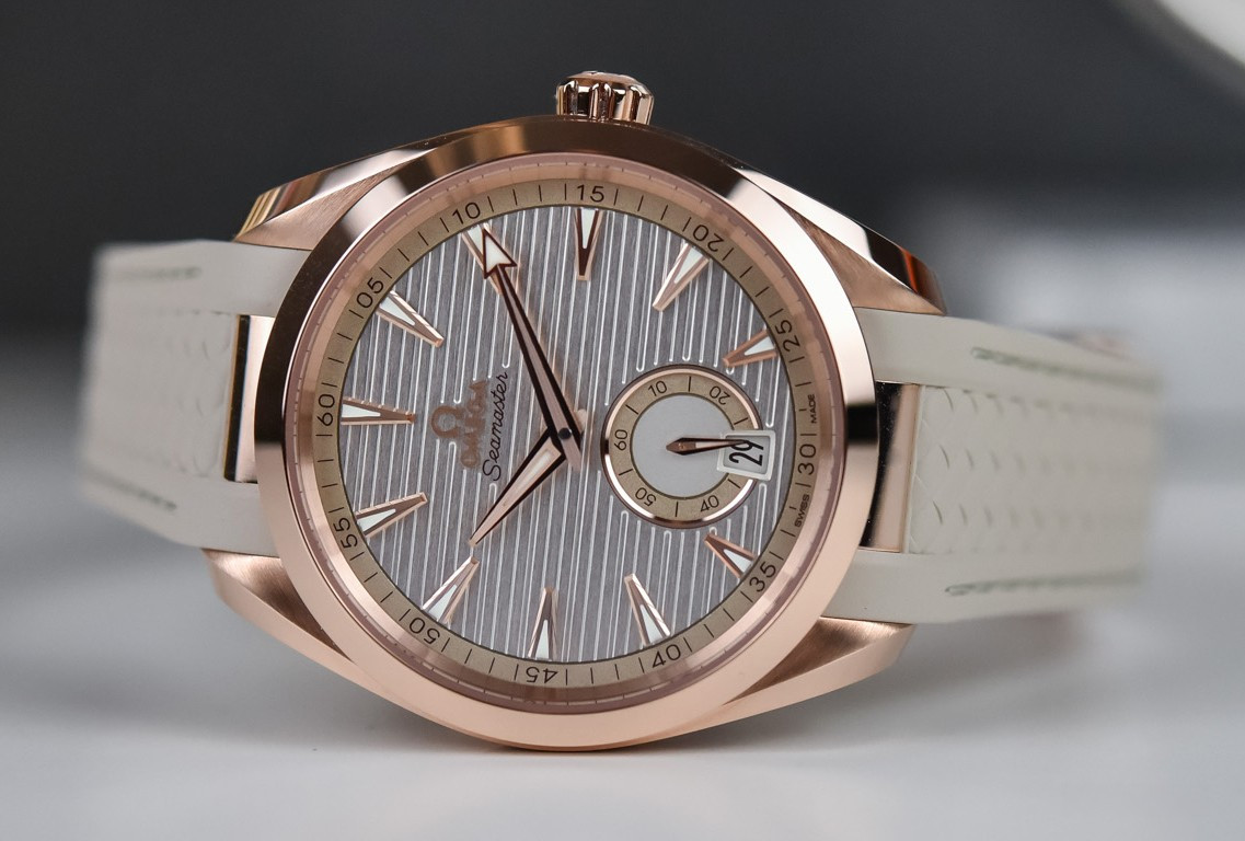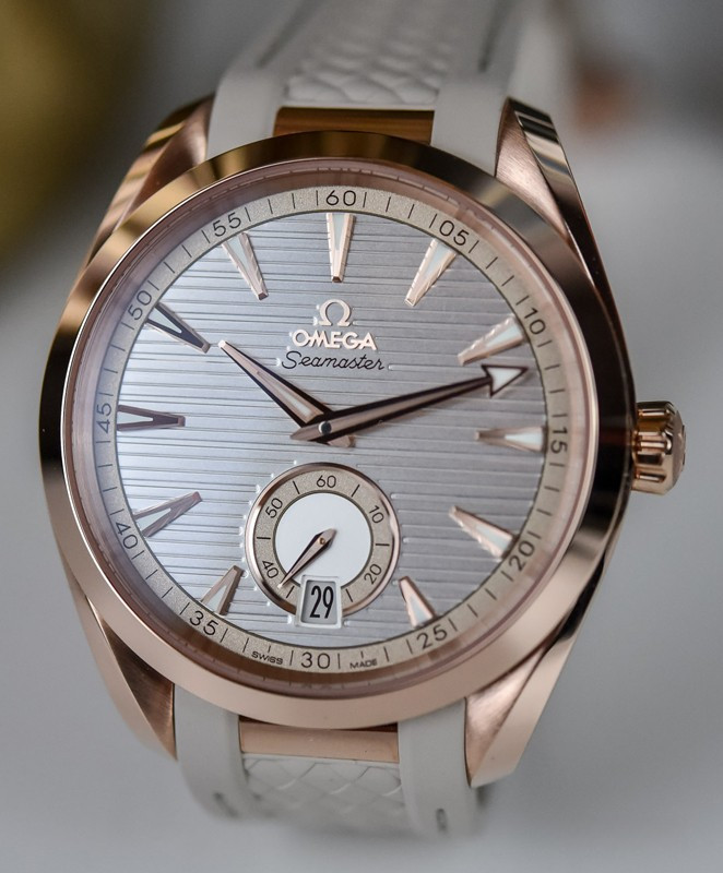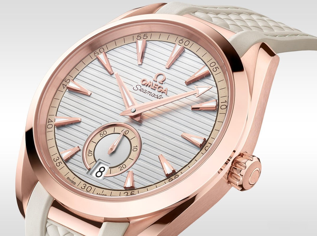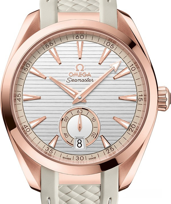 Часы Omega Seamaster Aqua Terra Small Seconds представлены в корпусе из розового золота 18к размером 41 х 13.5 мм водонепроницаемостью 150 метров. Внутри корпуса находится автоматический механизм, Калибр Omega 8917, обладающий запасом хода 60 часов. На серебристом гильошированном циферблате отображаются часы, минуты, секунды, дата. Часы поставляются на каучуковом ремешке с вставкой из розового золота 18к.