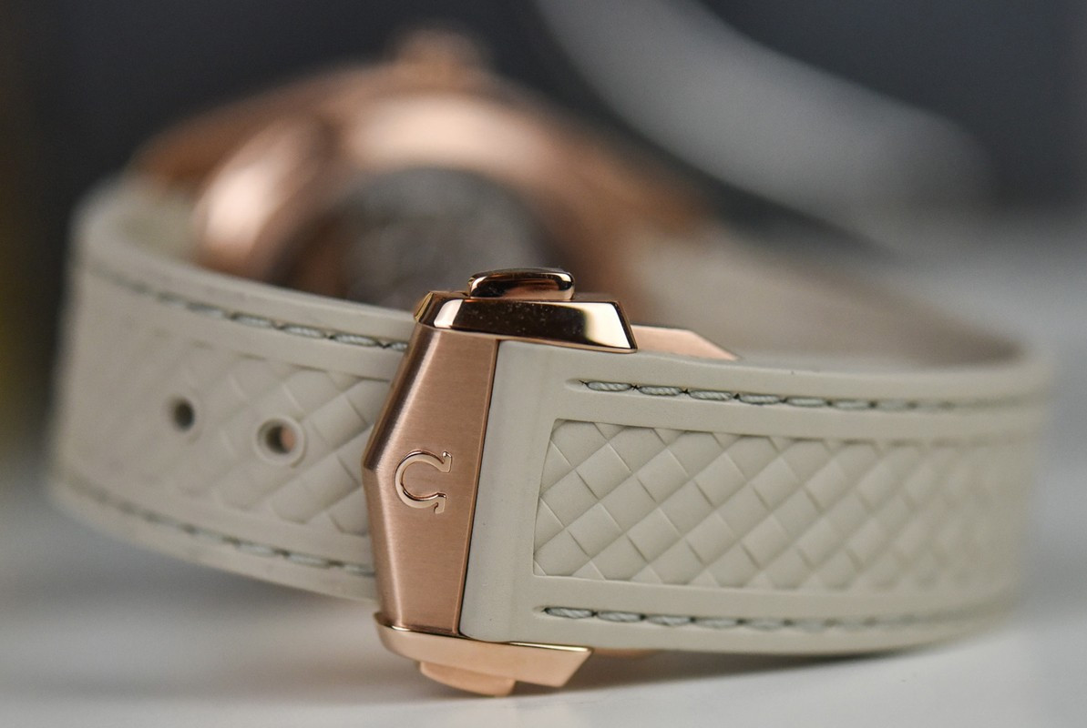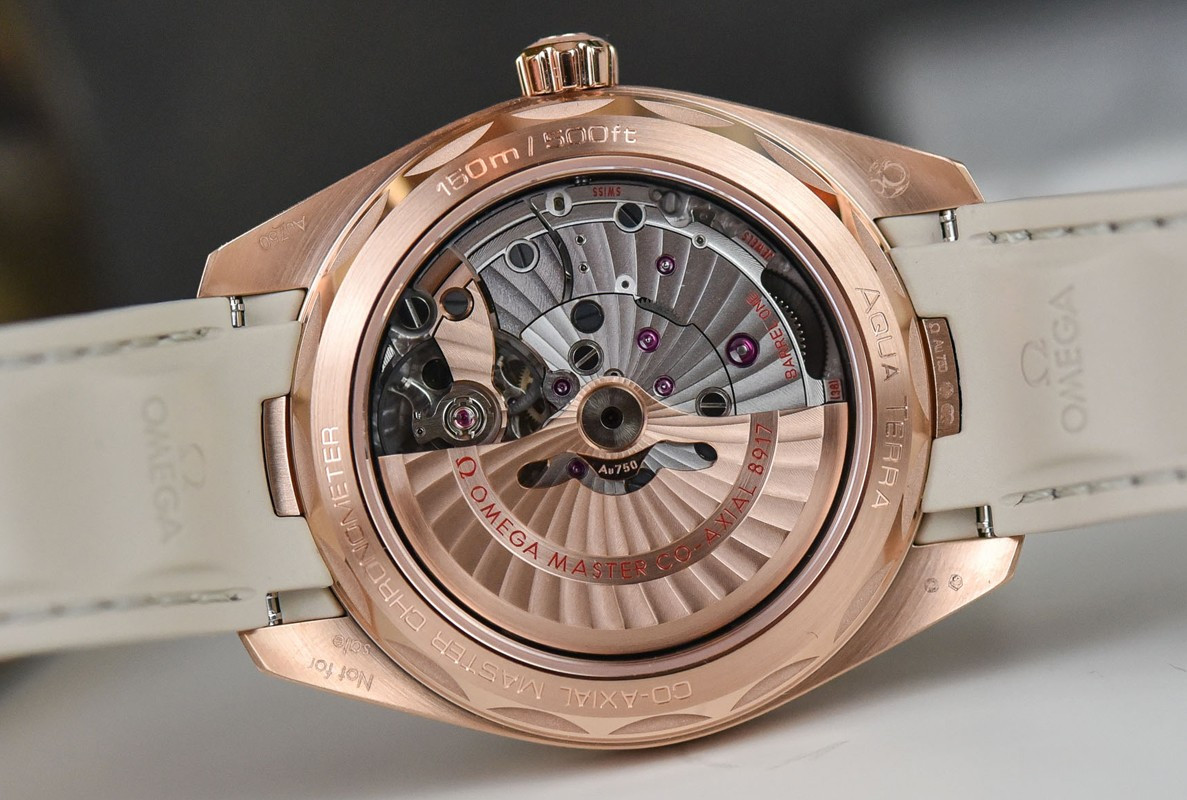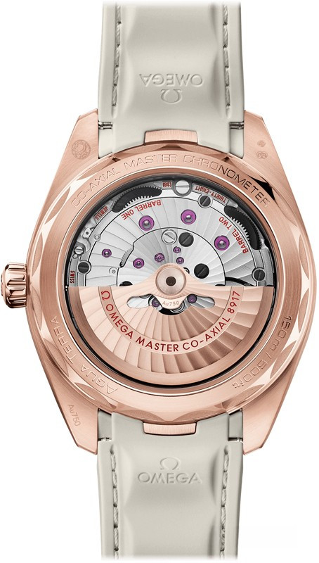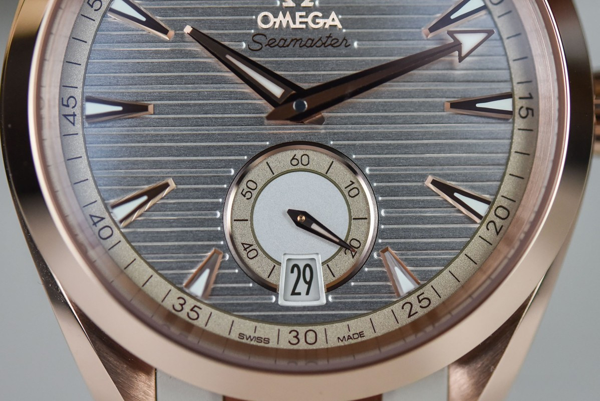 Часы Omega Seamaster Aqua Terra Small Seconds представлены в корпусе из розового золота 18к размером 41 х 13.5 мм водонепроницаемостью 150 метров. Внутри корпуса находится автоматический механизм, Калибр Omega 8917, обладающий запасом хода 60 часов. На серебристом гильошированном циферблате отображаются часы, минуты, секунды, дата. Часы поставляются на каучуковом ремешке с вставкой из розового золота 18к.
