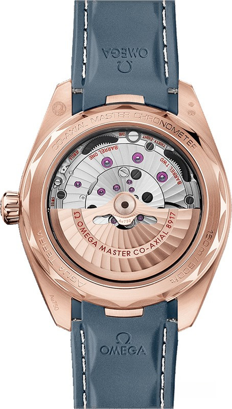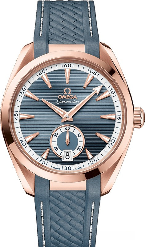 Часы Omega Seamaster Aqua Terra Small Seconds представлены в корпусе из розового золота 18к размером 41 х 13.5 мм водонепроницаемостью 150 метров. Внутри корпуса находится автоматический механизм, Калибр Omega 8917, обладающий запасом хода 60 часов. На синем гильошированном циферблате отображаются часы, минуты, секунды, дата. Часы поставляются на каучуковом ремешке с золотой застежкой.