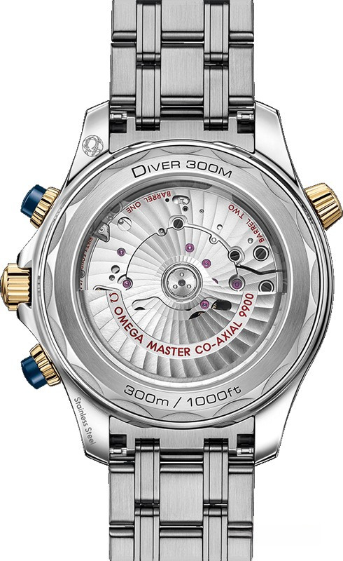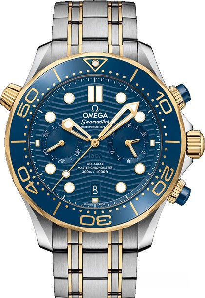 Часы Omega Seamaster Diver 300 m Omega Co-Axial Master Chronometer Chronograph 44 mm представлены в корпусе из нержавеющей стали и желтого золота 18к размером 44 мм и водонепроницаемостью 300 метров. На синем гильошированном циферблате отображаются часы, минуты, секунды, дата, накопители хронографа. Апертура даты расположена на 6-ти часах. Внутри корпуса установлен автоматический механизм 9901 с запасом хода 60 часов. Безель часов вращающийся. Часы комплектуются браслетом из нержавеющей стали и желтого золота 18к.