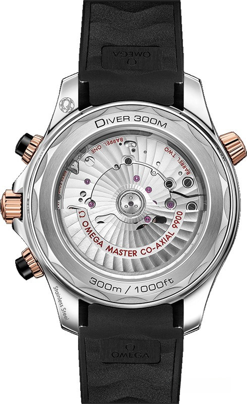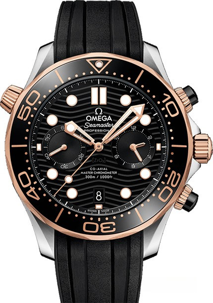 Часы Omega Seamaster Diver 300 m Omega Co-Axial Master Chronometer Chronograph 44 mm изготовлены в корпусе из нержавеющей стали и розового золота 18к размером 44 мм и водонепроницаемостью 300 метров. На черном гильошированном циферблате отображаются часы, минуты, секунды, дата, накопители хронографа. Апертура даты расположена на 6-ти часах. Внутри корпуса установлен автоматический механизм 9901 с запасом хода 60 часов. Безель часов вращающийся. Часы комплектуются каучуковым ремешком с вставкой из нержавеющей стали.