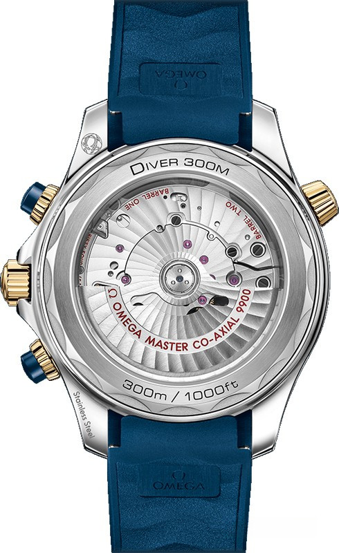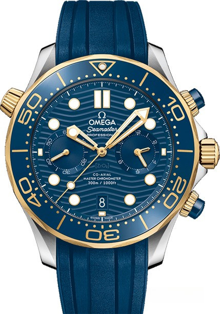 Часы Omega Seamaster Diver 300 m Omega Co-Axial Master Chronometer Chronograph 44 mm представлены в корпусе из нержавеющей стали и желтого золота 18к размером 44 мм и водонепроницаемостью 300 метров. На синем гильошированном циферблате отображаются часы, минуты, секунды, дата, накопители хронографа. Апертура даты расположена на 6-ти часах. Внутри корпуса установлен автоматический механизм 9901 с запасом хода 60 часов. Безель часов вращающийся. Часы комплектуются каучуковым ремешком с вставкой из нержавеющей стали.