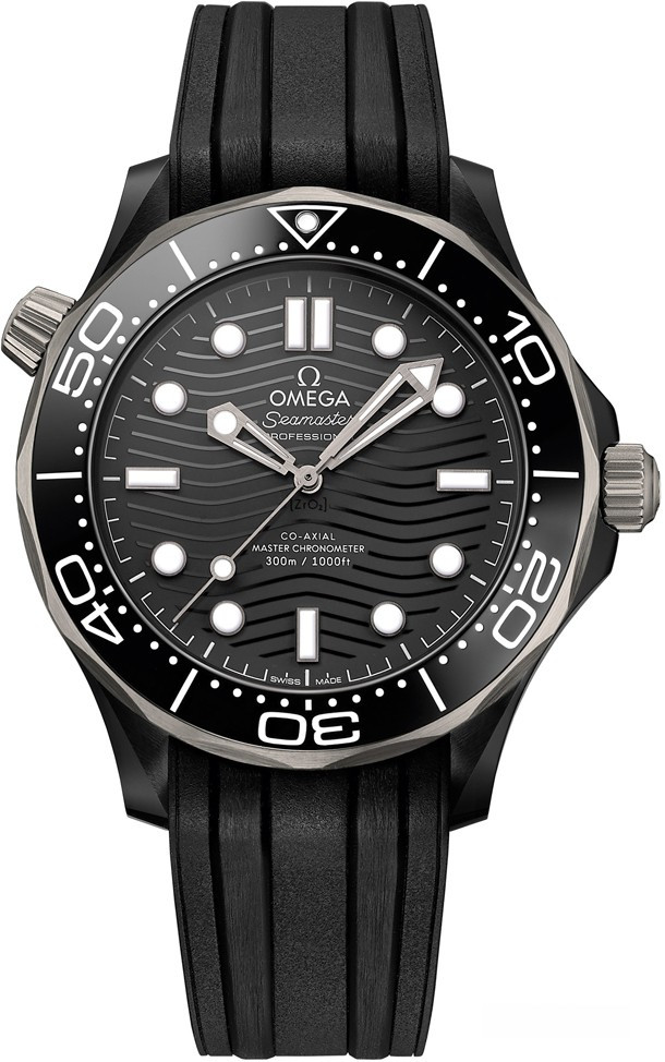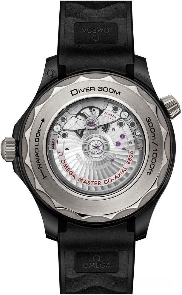 Компания Omega представила модель Seamaster Diver 300m в корпусе из черной керамики и титана. Часы комплектуются новым мануфактурным Калибром Omega 8806 с сертификатом METAS, внутренним протоколом для хронометров Omega. Механизм работает с частотой 25 200 пк/ч и обладает запасом хода 55 часов. Он устойчив к воздействию магнитных полей до 15 000 гаусс благодаря использованию кремниевой пружины. Надежность и изохронность этих часов не вызывает сомнений. Сочетание черного корпуса и титанового безеля с керамической вставкой подчеркивает красоту и спортивный характер часов. Черный циферблат покрыт волнистым узором. Omega Seamaster 300m Diver из черной керамики и титана оснащены гелиевым клапаном, который имеет коническую форму. Размер корпуса увеличился до 43.5 мм. Часы комплектуются каучуковым ремешком.