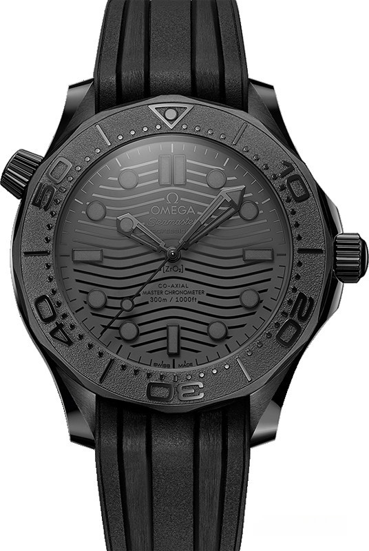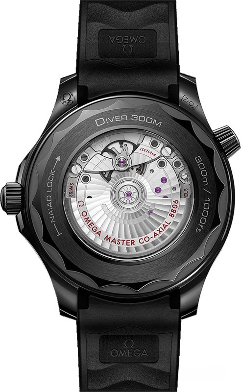 Часы Seamaster Professional Diver 300M, появившиеся на свет в 1993 году, привлекли внимание огромного количества ценителей часового искусства. Модели OMEGA 21-ого века остаются верны оригинальному дизайну дайверских часов, однако отличаются новыми высокотехнологичными материалами и механизмами. В данной модели диаметром 43,5 мм преобладает черная керамика [ZrO2]. Корпус, безель, циферблат с волнообразным узором, заводная головка и гелиевый клапан сделаны из этого превосходного материала, который придает часам эффектную графичность. Для того чтобы обеспечить видимость в ночное время, не нарушая эстетику модели, OMEGA сделала выбор в пользу антрацитового покрытия Super-LumiNova на дайверской шкале, а также черного PVD-покрытия на часовых метках, скелетонизированных стрелках и точке в положении «12 часов». Изделие дополнено интегрированным каучуковым ремешком и керамической застежкой черного цвета. Скелетонизированный корпус добавляет внешнему виду часов светлый акцент. Заднюю крышку с волнистым краем украшает сапфировое стекло, сквозь которое виден калибр OMEGA Co-Axial Master Chronometer 8806.