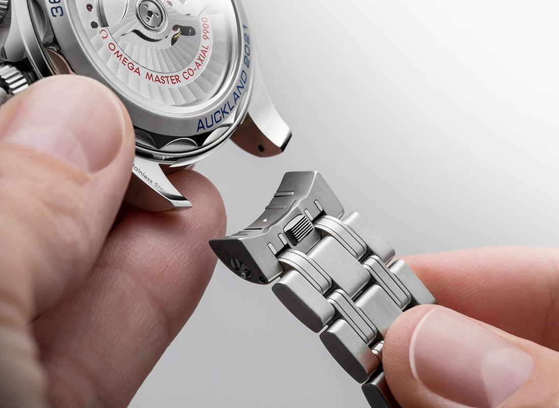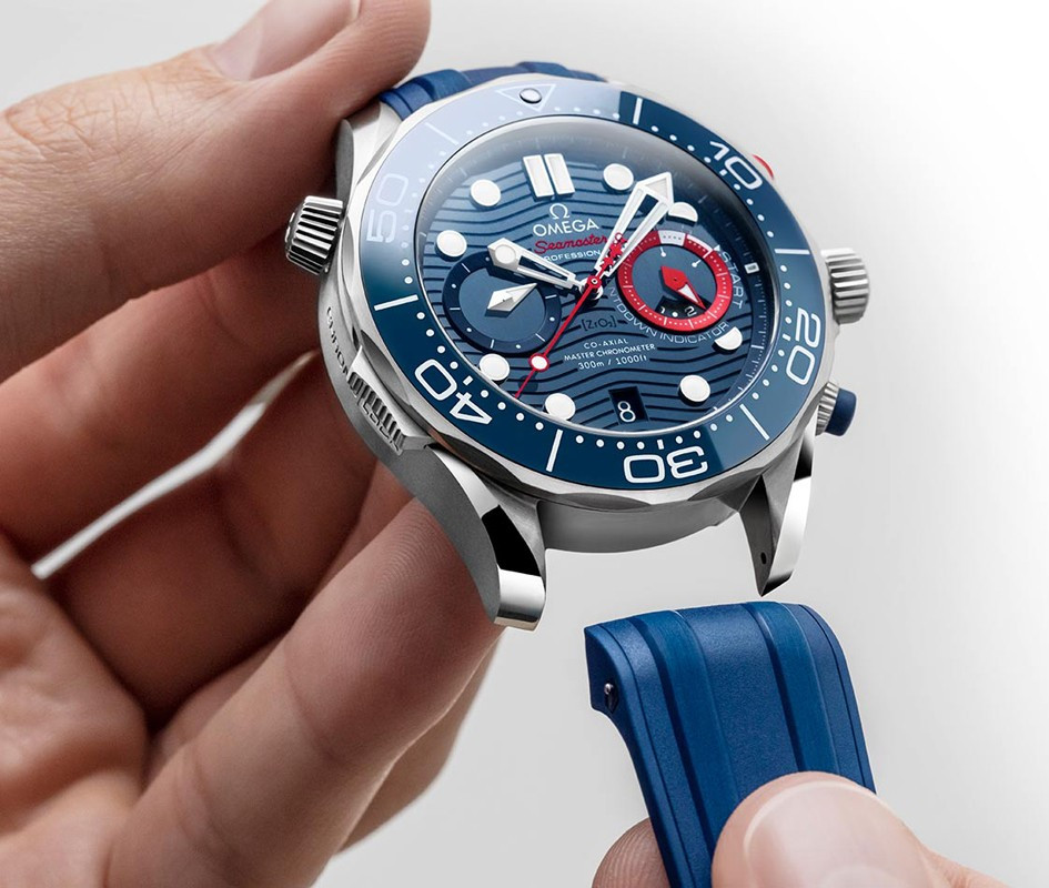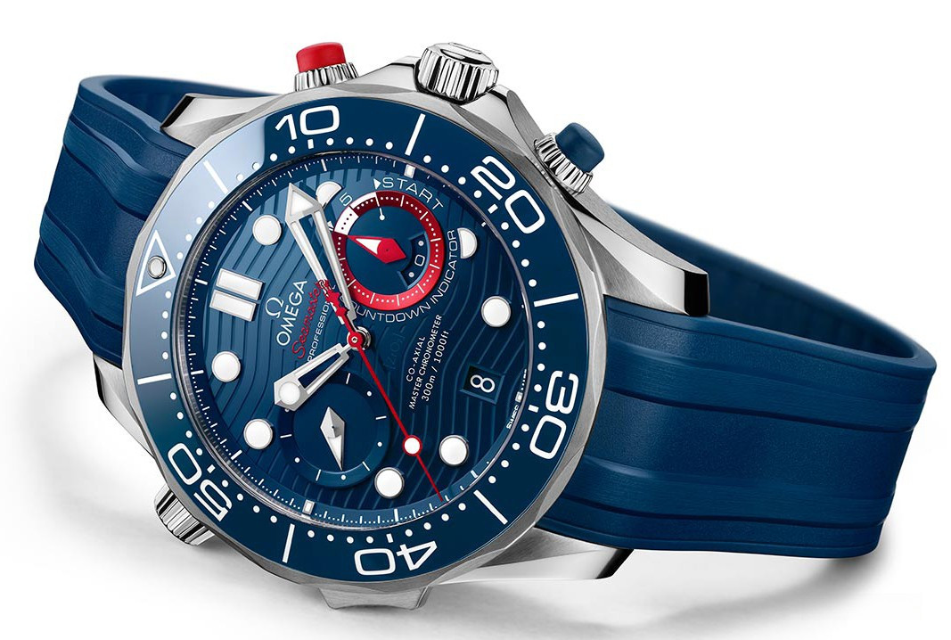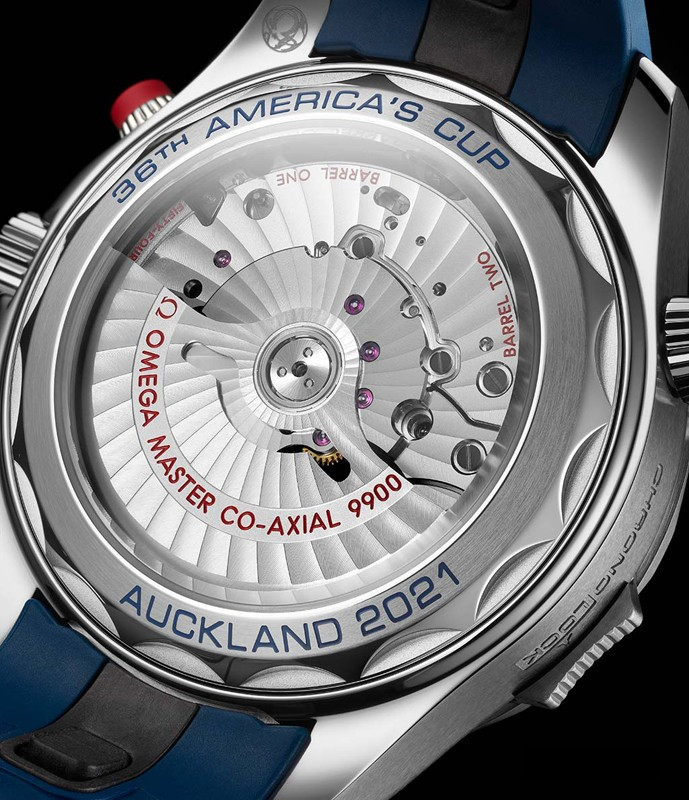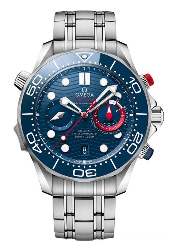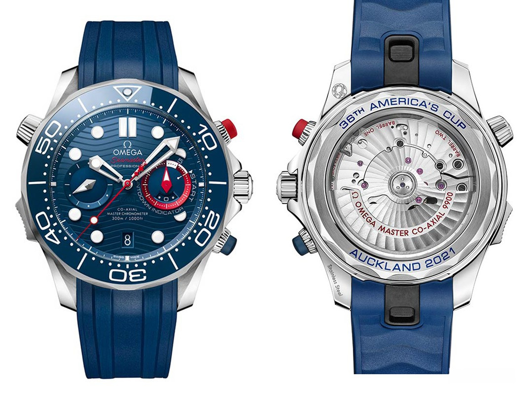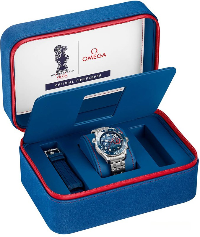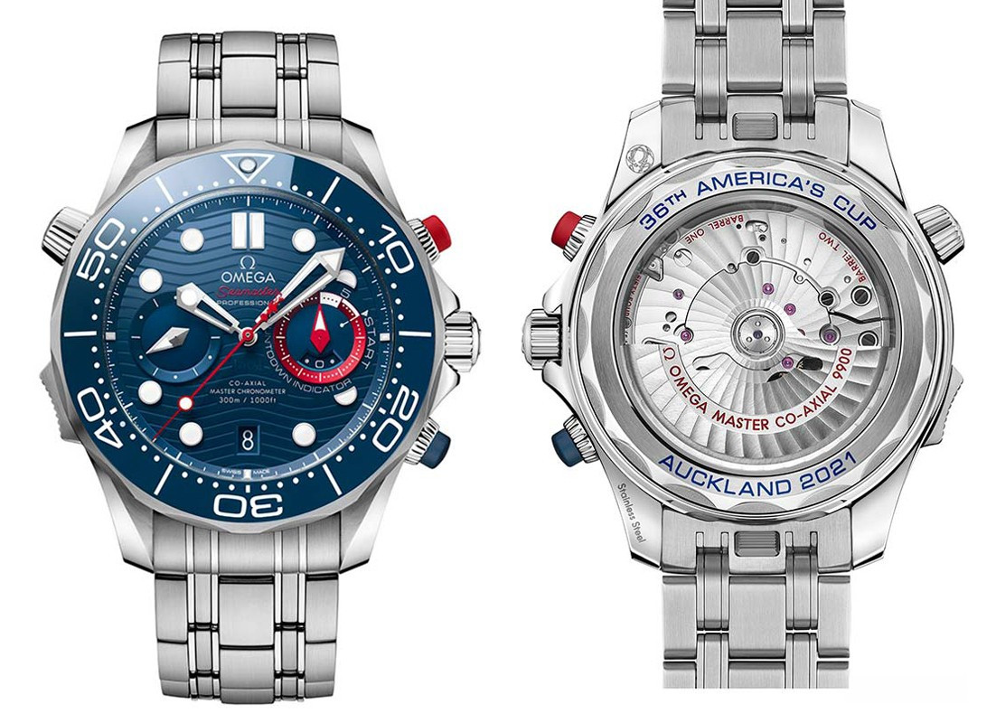 Часы Omega Seamaster Diver 300M America’s Cup Chronograph представлены в корпусе из нержавеющей стали размером 44 мм водонепроницаемостью 300 метров. Внутри корпуса установлен автоматический механизм, Калибр 9900, обладающий запасом хода 60 часов. На синем циферблате отображаются часы, минуты, секунды, дата, хронограф. Часы поставляются на браслете из нержавеющей стали.