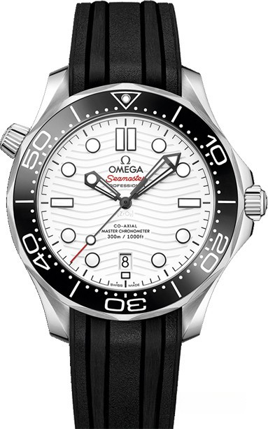 Часы Diver 300M в корпусе из нержавеющей стали с белым гильошированным циферблатом оснащены скелетонизированными часовой и минутной стрелками граненой формы. Безель дополнен дайверской шкалой. Сквозь прозрачное стекло задней крышки можно увидеть ротор с номером Калибра. Часы представлены на каучуковом ремешке с вставкой из нержавеющей стали. Часы оснащены эксклюзивным механизмом Omega 8800 с запасом хода 55 часов.