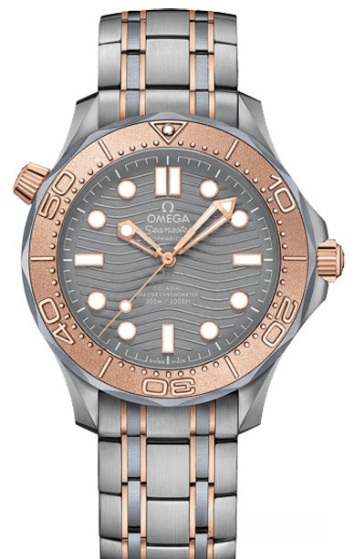 Часы Diver 300M в корпусе из титана и розового золота 18к с серым гильошированным циферблатом оснащены скелетонизированными часовой и минутной стрелками граненой формы. Золотой безель дополнен дайверской шкалой. Сквозь прозрачное стекло задней крышки можно увидеть ротор с номером Калибра. Часы представлены на титановом браслете с вставками из розового золота 18к. Часы оснащены эксклюзивным механизмом Omega 8800 с запасом хода 55 часов.