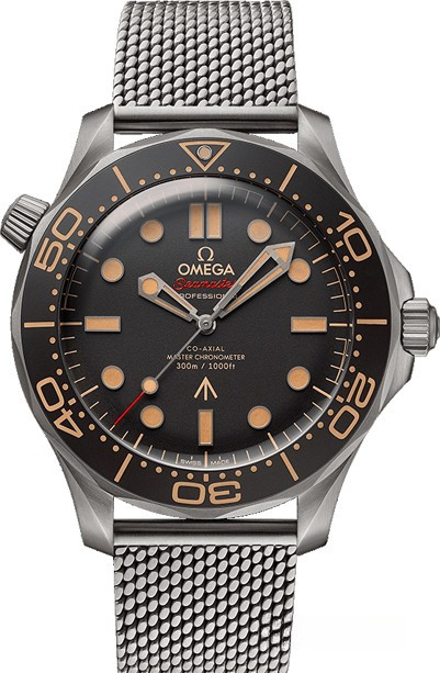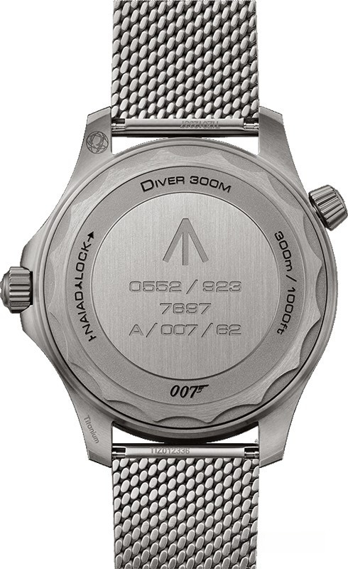 Модель Seamaster, идентичная часам агента 007 в фильме "Не время умирать", представлена в корпусе диаметром 42 мм из прочного, но легкого титана Grade 2 и имеет циферблат и кольцо безеля из алюминия коричневого "тропического" цвета. На задней крышке выгравирована серия цифр, формат которой соответствует настоящим военным часам, включая номер 62, указывающий на год премьеры первой кинокартины о Джеймсе Бонде "Доктор Ноу". Благодаря сапфировому стеклу эти часы стали немного тоньше, чем стандартные модели Diver 300M. Браслет сетчатого плетения выполнен из титана Grade 2 и дополнен инновационной регулируемой застежкой. Часы Diver серии 007 оснащены механизмом OMEGA Co-Axial Master Chronometer 8806, который отвечает высочайшим стандартам хронометрической точности и антимагнитной стойкости.
