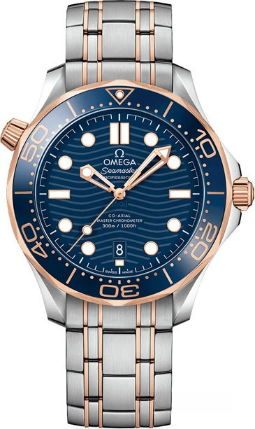 Часы Diver 300M в корпусе из нержавеющей стали и розового золота 18к с синим гильошированным циферблатом оснащены скелетонизированными часовой и минутной стрелками граненой формы. Золотой безель дополнен дайверской шкалой. Сквозь прозрачное стекло задней крышки можно увидеть ротор с номером Калибра. Часы представлены на браслете из нержавеющей стали с вставками из розового золота 18к. Часы оснащены эксклюзивным механизмом Omega 8800 с запасом хода 55 часов.