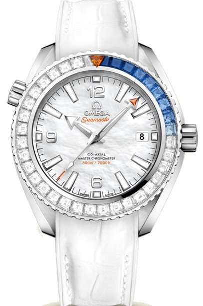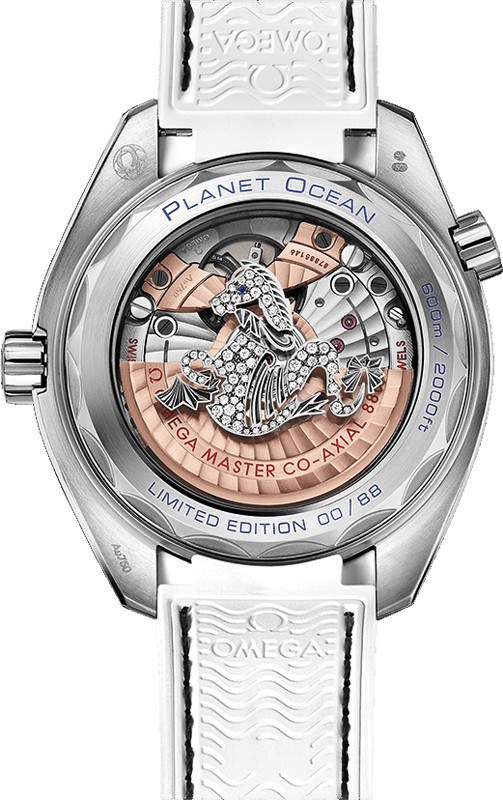 Богатое морское наследие компании OMEGA вдохновило ее на создание в 2005 году линии Planet Ocean. Новая стильная модель OMEGA Seamaster Planet Ocean 600M Master Chronometer отдает дань традициям дайверских часов компании. Ее белый жемчужный циферблат с арабскими цифрами и окошком даты в положении "3 часа" защищен устойчивым к царапинам сапфировым стеклом. Вращающийся в одном направлении безель из белых багетных бриллиантов и синих багетных сапфиров закреплен на корпусе диаметром 39,5 мм из белого золота 18к. Среди отличительных черт модели также завинчивающаяся задняя крышка с ячейками и ремешок из кожи аллигатора. Часы OMEGA Seamaster Planet Ocean 600M Master Chronometer снабжены гелиевым клапаном и имеют водонепроницаемость 600 метров / 2000 футов / 60 бар. В их сердце – механизм OMEGA Master Chronometer, калибр 8800, который можно увидеть сквозь прозрачное стекло задней крышки корпуса. Модель получила сертификат Master Chronometer, пройдя восемь интенсивных тестов по регламенту METAS (Швейцарского федерального института метрологии).