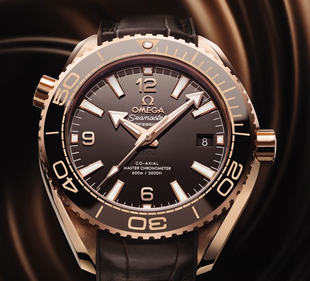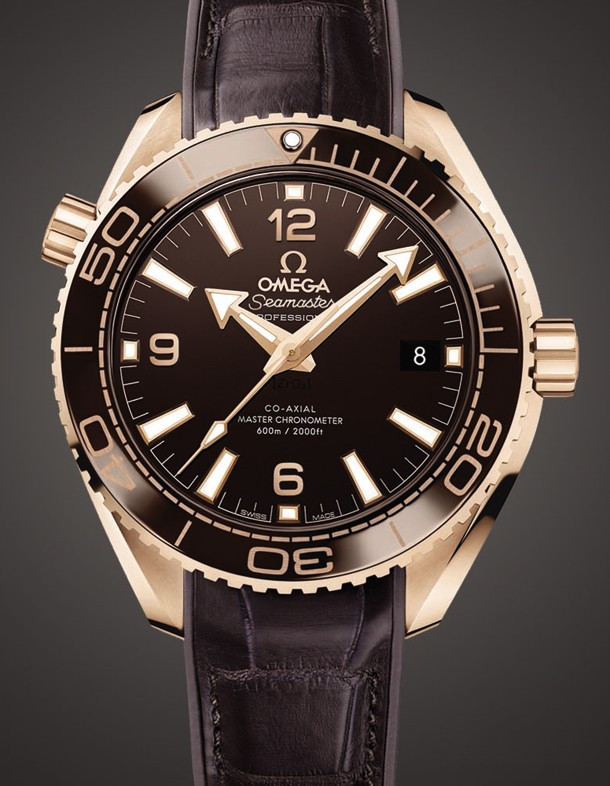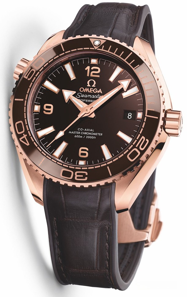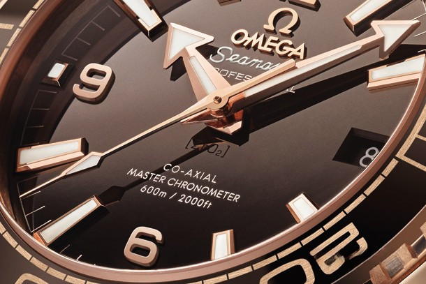 Диаметр новой модели Omega Seamaster Planet Ocean 600m Master Chronometer 39.5mm Sedna Gold составляет 39.5 мм. Последние изменения касаются материалов. Корпус модели выполнен из золота Sedna, собственного сплава розового золота Omega, более устойчивого к царапинам и без обесцвечивания со временем. Это специальное розовое золото использовано в создании корпуса, застежки, задней части корпуса, а также стрелок и индексов. Безель выполнен из Ceragold – коричневой керамики, заполненной жидким розовым золотом для создания цифр и шкал. Еще одним изменением является циферблат коричневого цвета (впервые для Omega), выполненный из керамики (о чем гласит надпись Zr02 на циферблате). Новые ремешки сочетают каучук и кожу аллигатора.