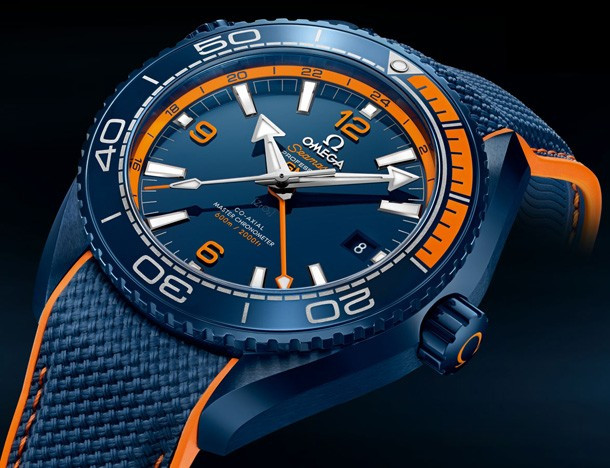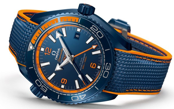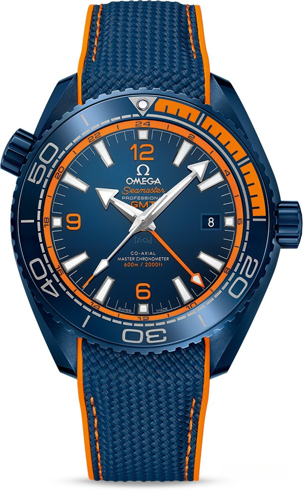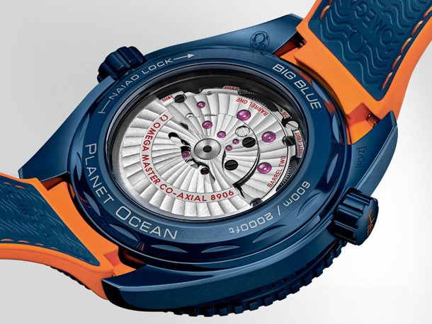 Корпус часов диаметром 45,5 мм оснащен керамическим циферблатом синего цвета с оранжевой шкалой GMT. Композицию дополняют сверкающие стрелки и индексы из 18-каратного белого золота с люминесцентным покрытием Super-LumiNova белого цвета. На безель из керамики синего цвета нанесена дайверская шкала с цифрами из материала Liquidmetal®. Сектор дайверской шкалы, соответствующий 15 минутам, выполнен из слоя каучука оранжевого цвета и керамики. Обратная сторона новой модели "Big Blue" поражает ничуть не меньше. Завинчивающаяся задняя крышка с волнистым краем, ставшая воплощением уникальной инновации часового Дома, выполнена из нового, запатентованного OMEGA керамического материала Naiad Lock, который позволяет устанавливать выгравированные надписи в правильном положении. Часы "Big Blue" оснащены часовым механизмом Omega Master Chronometer, калибр 8906. Они обладают водонепроницаемостью до 60 бар и способны выдерживать воздействие магнитных полей силой до 15 000 гаусс. Синий каучуковый ремешок с оранжевой прострочкой и кромками того же цвета по своей текстуре напоминает ткань. Он имеет антимикробное покрытие и дополнен раскладывающейся застежкой из керамики синего цвета, а его внутренняя сторона украшена волнообразным узором.