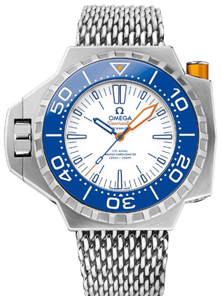 Знаменитая модель Ploprof, надежно работающая даже на глубине 4000 футов, давно прославилась как самые водонепроницаемые часы OMEGA. Новая версия сохранила присущий этой модели яркий и убедительный облик, а ее сердцем стал механизм OMEGA Co-Axial Master Chronometer, калибр 8912, с революционной технологией, обеспечивающей стойкость к воздействию магнитных полей и высокую хронометрическую точность. Уникальный корпус украшен неоново-синим керамическим безелем с цифрами, треугольником и шкалой, имеющими люминесцентное покрытие Super-LumiNova для лучшей считываемости показаний. Корпус часов и застежка браслета изготовлены из легкого титана Grade 5, а лакированный белый циферблат дополняют оранжевые и синие лакированные алюминиевые стрелки. Яркий дизайн этих часов напоминает о поразительных красках океана, а полированный браслет сетчатого плетения "Sharkproof" из титана Grade 2 намекает на приключения и отважные путешествия. Часы предлагаются в специальном подарочном футляре, внутри которого находится дополнительный ремешок из каучука неоново-синего цвета.