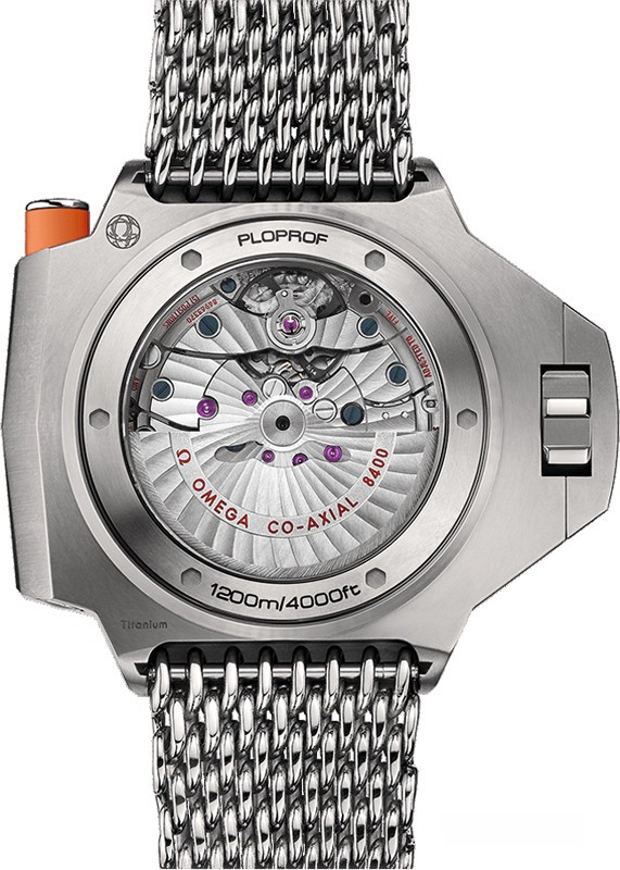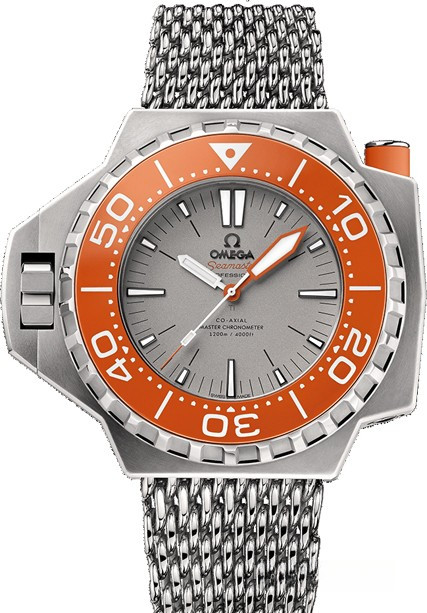 Знаменитая модель Ploprof, надежно работающая даже на глубине 4000 футов, давно прославилась как самые водонепроницаемые часы OMEGA. Новая версия сохранила присущий этой модели яркий и убедительный облик, а ее сердцем стал механизм OMEGA Co-Axial Master Chronometer, калибр 8912, с революционной технологией, обеспечивающей стойкость к воздействию магнитных полей и высокую хронометрическую точность. Уникальный корпус украшен оранжевым безелем из нитрид-кремниевой керамики с цифрами, треугольником и шкалой, имеющими люминесцентное покрытие Super-LumiNova для лучшей считываемости показаний. Из легкого титана Grade 5 изготовлены не только корпус и застежка браслета, но и циферблат часов, украшенный оранжевыми и белыми лакированными алюминиевыми стрелками. Дизайн с преобладанием металлических элементов манит совершить отважное морское путешествие, а полированный браслет сетчатого плетения "Sharkproof" из титана Grade 2 намекает на приключения.