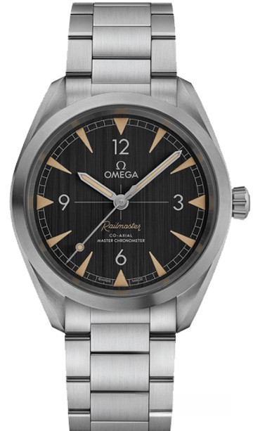 Модель Railmaster с корпусом диаметром 40 мм из сатинированной нержавеющей стали и заводной головкой конической формы оснащена циферблатом черного цвета с вертикальным сатинированием. Часы имеют углубленные часовые метки, заполненные составом Super-LumiNova винтажного оттенка; минутную шкалу в стиле "железная дорога"; прицельную марку Omega, символизирующую точность хода, и центральную секундную стрелку с круглым наконечником в стиле часов для железнодорожников. Модель Railmaster оснащена антимагнитным калибром Master Chronometer Calibre 8806, помещенным на задней крышке с волнистым краем, на которую нанесено рельефное изображение морского конька. Система Naiad Lock позволяет устанавливать выгравированные на крышке надписи в правильном положении.