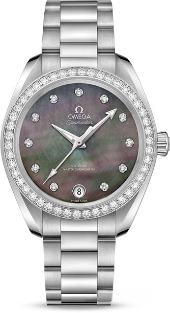 Женские часы Seamaster Aqua Terra в обрамлении из бриллиантов являют собой образец истинной элегантности. Симметричный корпус этой модели диаметром 34 мм выполнен из нержавеющей стали. На черном жемчужном циферблате располагаются окошко указателя даты в положении "6 часов" и 11 бриллиантовых индексов в оправе с родиевым покрытием. Эти часы, оснащенные калибром Omega Co-Axial Master Chronometer 8800, сертифицированы Швейцарским федеральным институтом метрологии (METAS) в соответствии с высочайшими стандартами часовой индустрии. Они предлагаются с интегрированным браслетом из нержавеющей стали. Безель из белых бриллиантов.