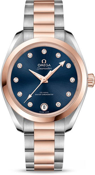 Женские часы Seamaster Aqua Terra в обрамлении из бриллиантов являют собой образец истинной элегантности. Симметричный корпус этой модели диаметром 34 мм выполнен из нержавеющей стали и розового золота 18к. На синем циферблате располагаются окошко указателя даты в положении "6 часов" и 11 бриллиантовых индексов в оправе с родиевым покрытием. Эти часы, оснащенные калибром Omega Co-Axial Master Chronometer 8800, сертифицированы Швейцарским федеральным институтом метрологии (METAS) в соответствии с высочайшими стандартами часовой индустрии. Они предлагаются с интегрированным браслетом из нержавеющей стали и розового золота 18к.
