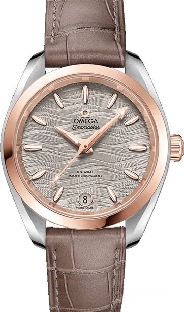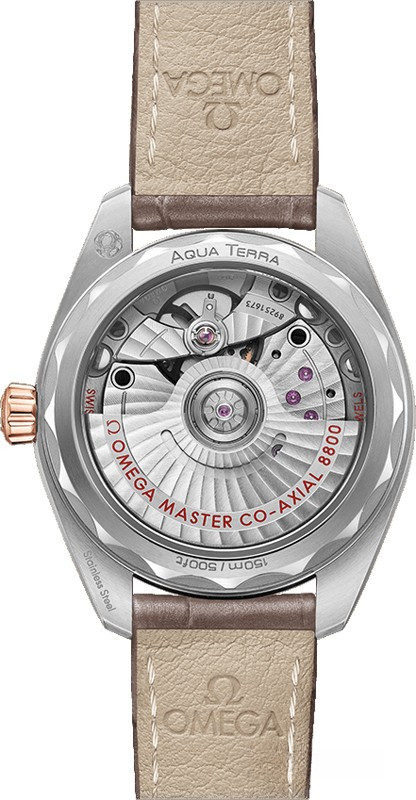 Женские часы Seamaster Aqua Terra являют собой образец истинной элегантности. Симметричный корпус этой модели диаметром 34 мм выполнен из нержавеющей стали и розового золота 18к. На серебристом гильошированном циферблате располагаются окошко указателя даты в положении "6 часов", часовая, минутная и секундная стрелки. Эти часы, оснащенные Калибром Omega Co-Axial Master Chronometer 8800, сертифицированы Швейцарским федеральным институтом метрологии (METAS) в соответствии с высочайшими стандартами часовой индустрии. Они предлагаются с ремешком из кожи аллигатора с вставкой из нержавеющей стали.