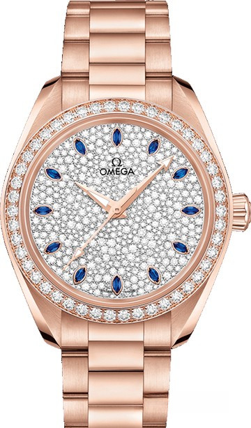Женские часы Seamaster Aqua Terra являют собой образец истинной элегантности. Симметричный корпус этой модели диаметром 34 мм выполнен из розового золота 18к. На циферблате с белыми бриллиантами и 12-ю синими сапфирами располагаются часовая, минутная и секундная стрелки. Эти часы, оснащенные Калибром Omega Co-Axial Master Chronometer 8800, сертифицированы Швейцарским федеральным институтом метрологии (METAS) в соответствии с высочайшими стандартами часовой индустрии. Они предлагаются с браслетом из розового золота 18к. Безель из белых бриллиантов.