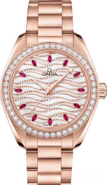 Женские часы Seamaster Aqua Terra являют собой образец истинной элегантности. Симметричный корпус этой модели диаметром 34 мм выполнен из розового золота 18к. На серебристом гильошированном циферблате с белыми бриллиантами и 12-ю красными рубинами располагаются часовая, минутная и секундная стрелки. Эти часы, оснащенные Калибром Omega Co-Axial Master Chronometer 8800, сертифицированы Швейцарским федеральным институтом метрологии (METAS) в соответствии с высочайшими стандартами часовой индустрии. Они предлагаются с браслетом из розового золота 18к. Безель из белых бриллиантов.
