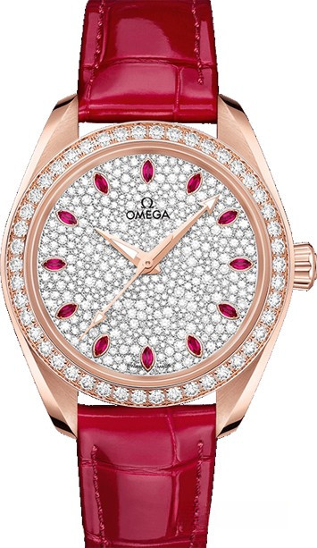 Женские часы Seamaster Aqua Terra являют собой образец истинной элегантности. Симметричный корпус этой модели диаметром 34 мм выполнен из розового золота 18к. На циферблате с белыми бриллиантами и 12-ю красными рубинами располагаются часовая, минутная и секундная стрелки. Эти часы, оснащенные Калибром Omega Co-Axial Master Chronometer 8800, сертифицированы Швейцарским федеральным институтом метрологии (METAS) в соответствии с высочайшими стандартами часовой индустрии. Они предлагаются с ремешком из кожи аллигатора с вставкой из розового золота 18к. Безель из белых бриллиантов.